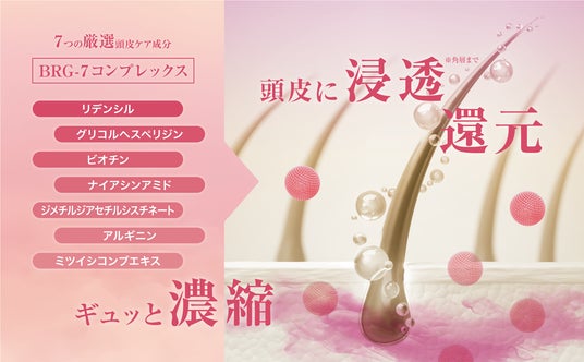 - 頭皮ケア成分をギュッと濃縮リデンシル※1を含む7種の頭皮ケア成分を厳選し、コンプレックス配合。スプレーノズルで狙った頭皮に集中浸透※2させて確実に届ける独自のBGR-7濃縮集中システムを採用。
