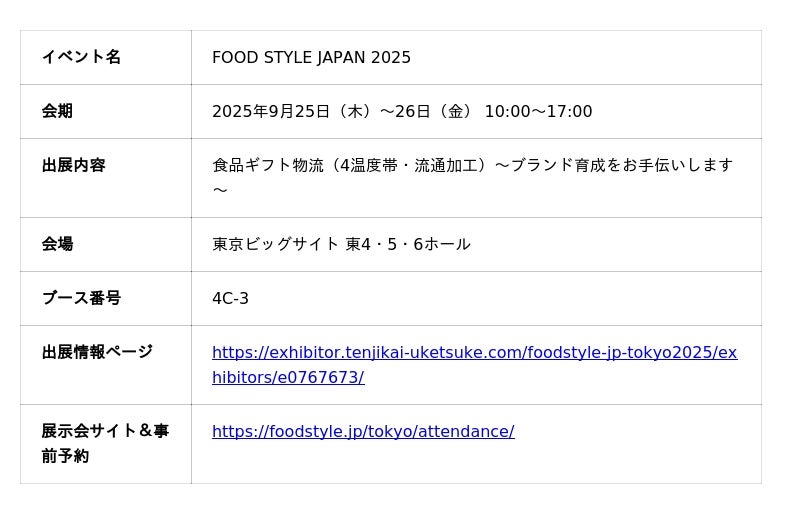 2025年9月25・26日に東京ビッグサイトで開催される「FOOD STYLE JAPAN 2025」に出展いたします。食品事業者の皆様に向けて、当社が提供する食品物流サービスの魅力と導入メリットをご紹介するブースを展開します。ぜひご来場の際は、