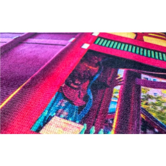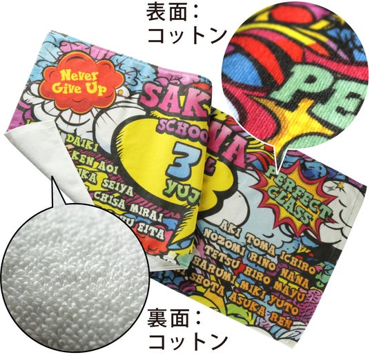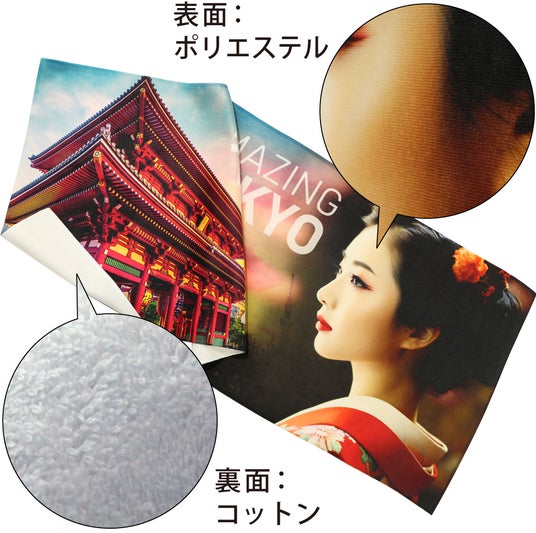ワンデイタオル(やわらかプリント)を見る<ワンデイタオル(くっきりプリント)>1日で作れるワンデイタオルシリーズの、くっきりプリント(昇華転写プリント)タイプも、全面にフルカラーのデザインがプリント可能です。表面がポリエステル100%のなめらかな生地で、デザイン表現を極限まで高めました。スポーツ観戦や部活動の応援、周年記念品、卒業・卒団記念品、観光ノベルティとして活用することができます。最短翌日出荷で、1枚~ご注文可能です。
