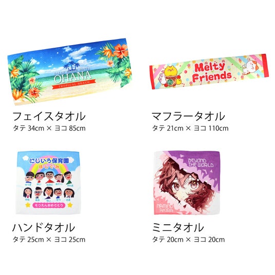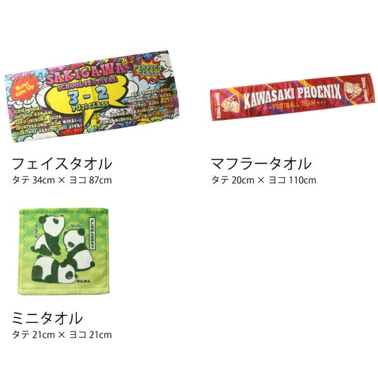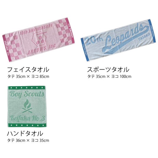 おすすめ用途:スポーツチーム、サークルのお揃いタオルや記念品用、企業イベントのノベルティ・販売用グッズとして活用できます。