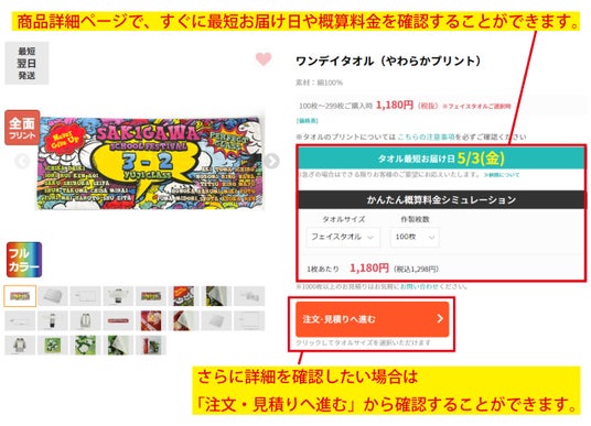 各商品ページで最短お届け日の表示と概算シミュレーションがございます。