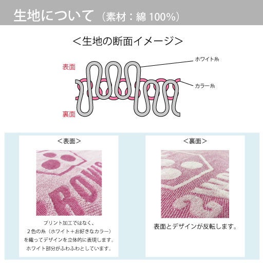 生地:綿100%で、表面を平らにカットしており、凹凸がなくプリントに適しています。裏面はカットしていないので吸水性も良く、タオルとしての実用性も高い生地です。