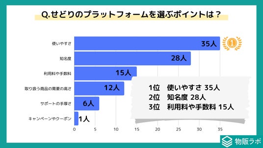 せどりのプラットフォームを選ぶポイントで最も多かったのは、「使いやすさ」で35人、次いで「知名度」が28人という結果になりました。