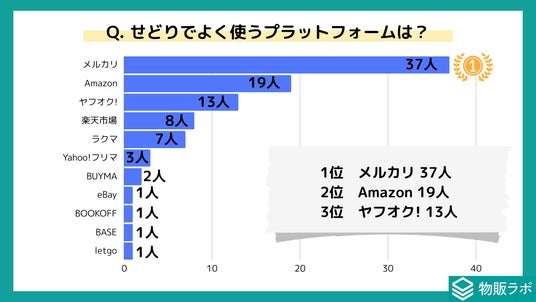 せどりでプラットフォームで最も多かったのは「メルカリ」で37人でした。次いで「Amazon」が19人、さらに「ヤフオク!」が13人という結果になりました。