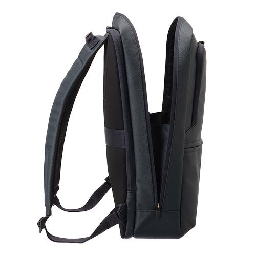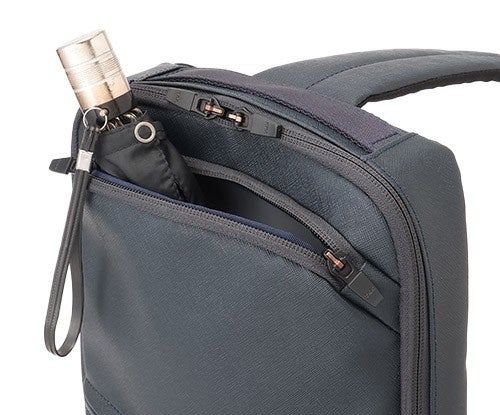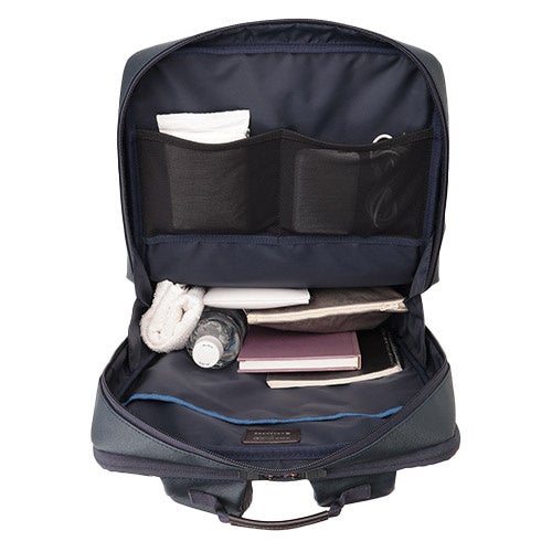 スマートな見た目にもかかわらず、しっかりした収納力を誇ります。バックパックとボディバッグはガバッと開くフルオープン仕様で、容量もたっぷり。バックパックは“ササマチ”という2つ折りのマチで、中身が横からこぼれ落ちるのを防ぎます。また、ダークネイビーの生地にさりげないアクセントとしてダークブラウンのパーツを合わせ、単調にならないよう工夫をしています。