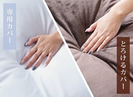 もちろん枕カバーにもこだわって2種類ご用意しました。「専用カバー」は上品なうすい紫色で清潔感のある仕上げに。「とろけるカバー」は肌触りにこだわっており、文字通り足を乗せると