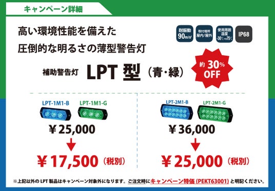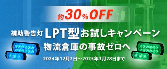 ■「物流倉庫の事故ゼロへ 補助警告灯LPT型お試しキャンペーン」概要 フォークリフト事故など物流倉庫での安全対策が課題となっている中、より気づきやすい圧倒的な報知力が求められています。補助警告灯LPT型は、車載を目的とした仕様であることから、圧倒的な明るさ・認知しやすい発光パターン・高い環境性能を有しており、安全対策としても非常に高い評価を得ています。今回は、LPT型の良さをお試しいただくために、青色と緑色の2色、2サイズをキャンペーン特価で提供いたします。