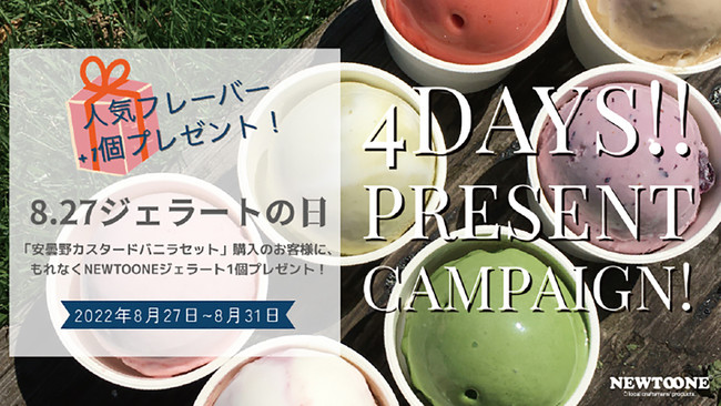 今回、NEWTOONEでは、日本ジェラート協会が制定する8月27日(土)の「ジェラートの日」にあわせて、8/27~8/31のキャンペーン期間中、新発売の「安曇野カスタードバニラセット」をご購入いただいたお客様に、価格そのままに、もれなくNEWTOONEのクラフトジェラートを1個プレゼントする『プラスワンキャンペーン』を実施いたします。※プラスされるクラフトジェラートのフレーバーはランダムになりますので、予めご了承ください。