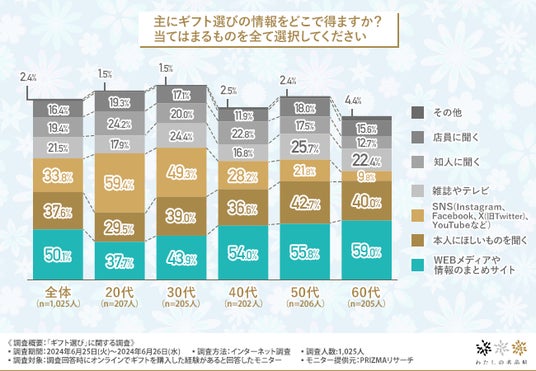 「WEBメディアや情報のまとめサイト」と「SNS(Instagram、Facebook、X(旧Twitter)、YouTubeなど)」を合わせると約8割となり、ギフトを選ぶためにインターネット上で情報を得ている方が多い傾向が示されました。