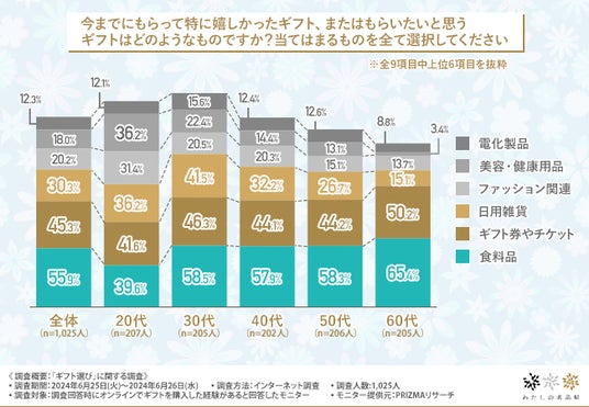 「食料品」が約6割、「日用雑貨」「ギフト券やチケット」は約3割となり、相手のことを考えて消えものや普段の生活で使えるものを選ぶ傾向にあるようです。