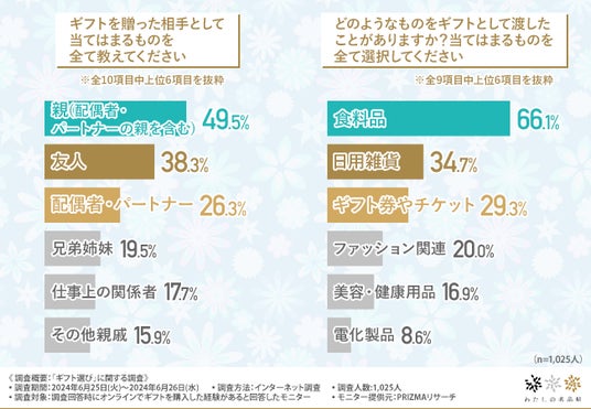 「親(配偶者・パートナーの親を含む)」と同居している方は約2割で、ギフトを贈った相手としては「親(配偶者・パートナーの親を含む)」と回答した方が約半数であることから、同居していない親にギフトを贈った方が多いことが示唆されました。