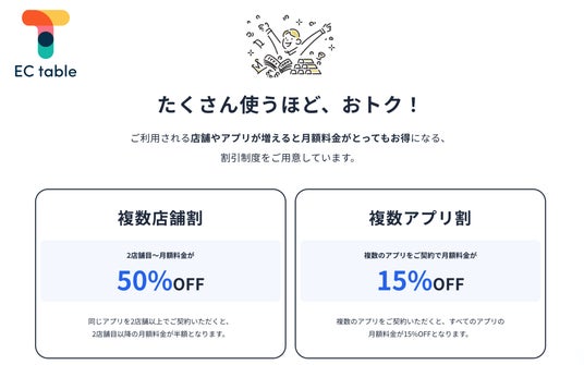 複数店舗利用で2店舗目以降が50%OFF。複数アプリ利用で月額料金が15%OFFに。