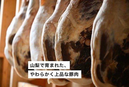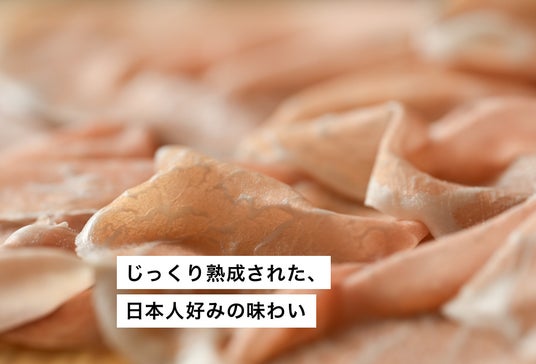 山梨県産の銘柄豚「甲州乳酸菌豚 クリスタルポーク」と瀬戸内産の藻塩を使用した、完全無添加の自然熟成生ハムです。乳酸菌を含む飼料で育った豚肉は、柔らかく旨味が強いのが特徴。スペイン産のハモンセラーノのような強い塩味ではなく、イタリア・パルマ産に近い、しっとりと優しい味わいを目指し、塩辛すぎず甘みのある仕上がりです。
