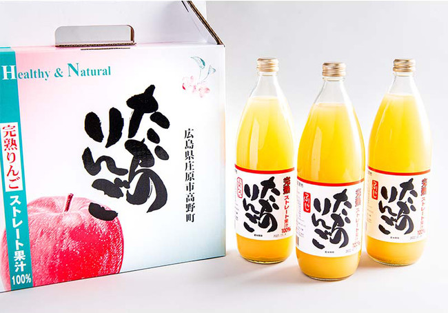 庄原市高野町は標高が高く昼と夜の寒暖差があり、リンゴ栽培に適した土地柄です。ひとつの樹に何百個ものりんごの実がなり、大きな実もなれば小さな実もなります。全てのりんごの実を余すことなく楽しんでいただきたいという思いのもと、りんごジュースを搾っています。完熟したりんごを収穫していますので、年内でりんごの販売はほとんど終わりますが、ジュースは一年中楽しめます。