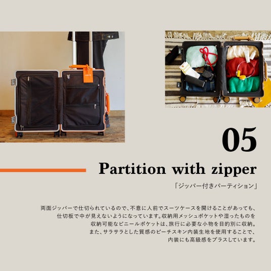 両面ジッパーで仕切られているので、不意に人前でスーツケースを開けることがあっても、パーティションで中が見えないようになっています。収納用メッシュポケットや湿ったものを収納可能なビニールポケットは、旅行に必要な小物を目的別に収納。