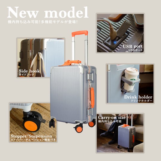 revelのオシャレなデザインとカラーリングをそのままに、ドリンクホルダー、USBポート、サイドフックを搭載した多機能スーツケース。
