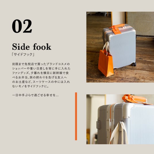 刻限まで免税店で買ったブランドコスメのショッパーや暑い日差しを背に手に入れたファングッズ、夕暮れを横目に新幹線で食べるお弁当、旅の終わり友人へのお土産など、スーツケースの中には入れないモノをサイドフックに。1日中手ぶらで過ごせる幸せを…