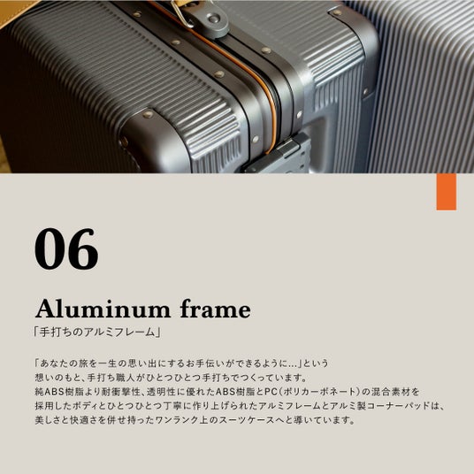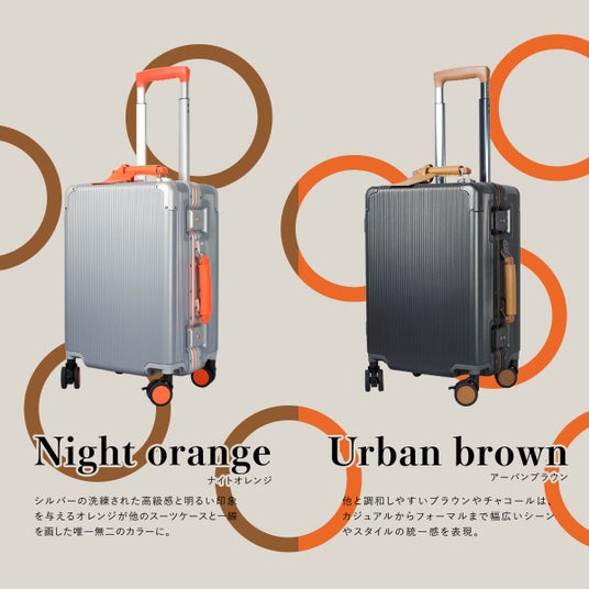 シルバーカラーの洗練された高級感と明るい印象を与えるオレンジカラーが、他のスーツケースと一線を画した唯一無二のカラーに。