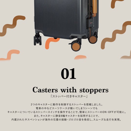 電車の中などスーツケースが動いてしまうシーンでも、キャスターについているストッパースイッチを操作することで、簡単にストッパーのON・OFFが可能に。またキャスターに静音8輪サスペンションキャスターを採用することで、海外の石畳の振動・ゴロゴロ音を吸収しスムーズな走行を実現。