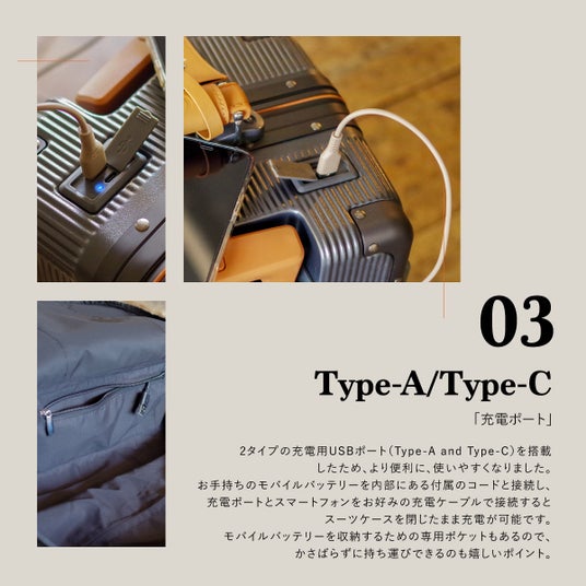 お手持ちのモバイルバッテリーを内部にある付属のコード(Type-A)と接続し、お手持ちの充電ケーブルを充電ポートに差し込んでスマートフォンと接続することでスーツケースを閉じたまま充電が可能です。