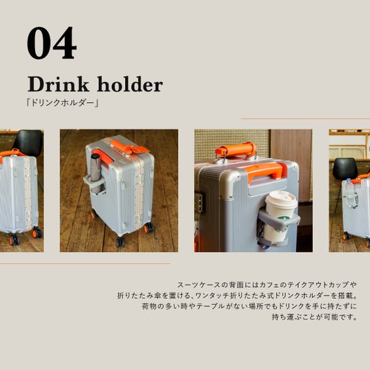 スーツケースの背面にはカフェのテイクアウトカップや折りたたみ傘を置ける、ワンタッチ折りたたみ式ドリンクホルダーを搭載。荷物の多い時やテーブルがない場所でもドリンクを手に持たずに持ち運ぶことが可能です。