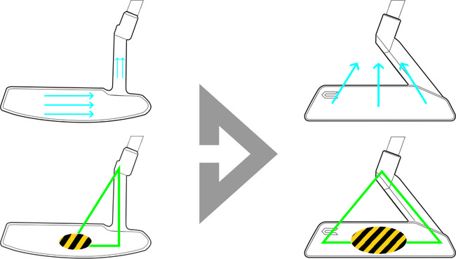 3.地面に密着する低重心のヘッドバランスマレット型で独自の三角構造を採用しました。シャフトをセンター置くことでトゥとヒールの安定したバランスを保ったまま、直進性高いストロークができるようになりました。