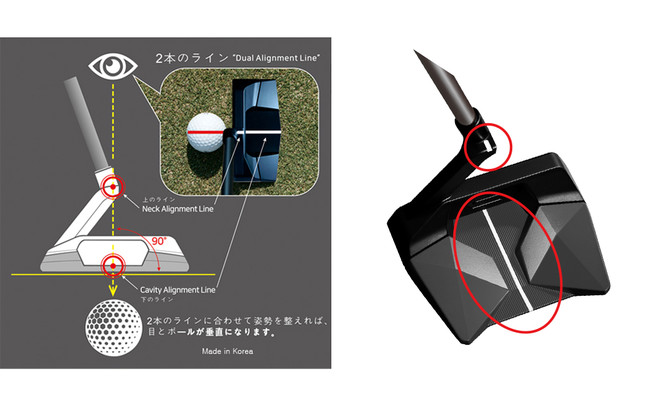 1.見下ろしたその先の2本線に照準を合わせるだけ!今までになかった驚異の再現性パターのネックとヘッドにある2本のラインをピッタリ合わせれば、ミリ単位の調整が可能で、常にボールを目線の下にセットできます。自然に姿勢が変わります。