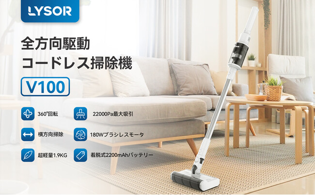 LYSOR V100 コードレス掃除機 全方向360°回転 強力吸引22KPA