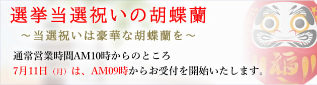 選挙の投開票の翌日は、いち早く当選のお祝いの胡蝶蘭を送りたいとのお客様で、お問い合わせを多く頂いております。