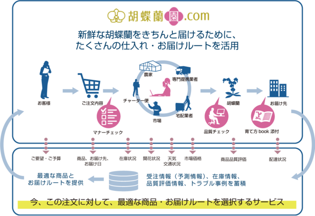 全国の農家や配送拠点と提携体制を構築し、全国にお届けできる他、「花屋には並ばない胡蝶蘭」等、多種多様な胡蝶蘭をご提供する環境を持っています。