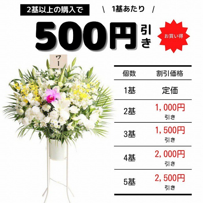 彩株式会社法人フラワーギフトの定番の胡蝶蘭・スタンド花・花束、そして、お供えの葬儀の花をまとめて注文すればする程安くなるサービスを開始。