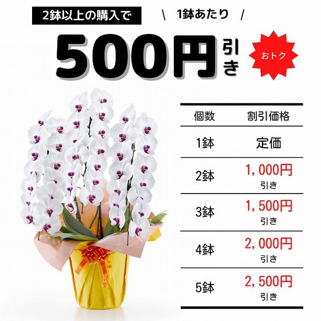 人気の胡蝶蘭は2鉢~から1,000円割引が入り、以降買うごとにどんどん安くなる。