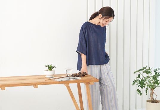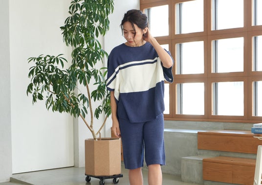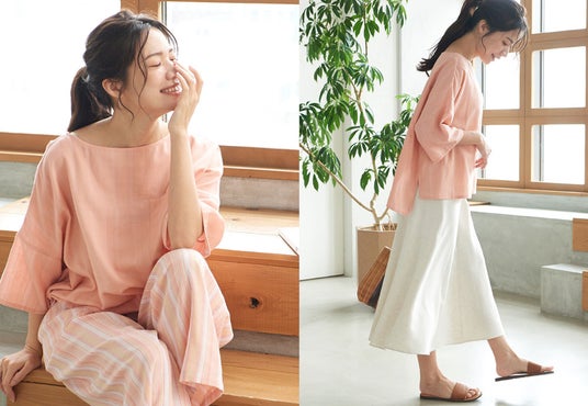 トップスとボトムスで表情を変えているので、それぞれが他のアイテムとも合わせやすく、おうちだけでなく様々なシーンで着ることができます。