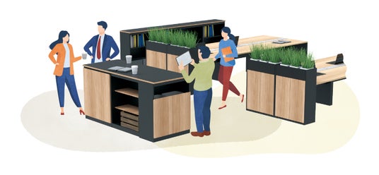大川夏の彩展2024■展示商品の一部紹介・Riposo(リポーゾ)「ひらめきは、自然体から溢れる ふとした一息から。」をもとに、さまざまなバックグラウンドや世代の人々が集まるコミュニティスペースをオフィス内につくれる、アイランドカウンターやプランターパーティションの”Riposo(リポーゾ)”