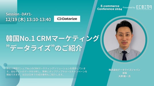 株式会社データライズジャパン(所在地:東京都港区、代表取締役:キム・ソンム 韓国本社:Datarize、本社所在地:ソウル市)は、2024年12月19日(木)~20日(金)に開催されるオンラインイベント「 E-commerce Conference 2024~2024年のEC業界を総復習する2日間~」に登壇し、韓国市場でNo.1シェアを誇るCRMソリューション「Datarize」を日本市場に初公開いたします。