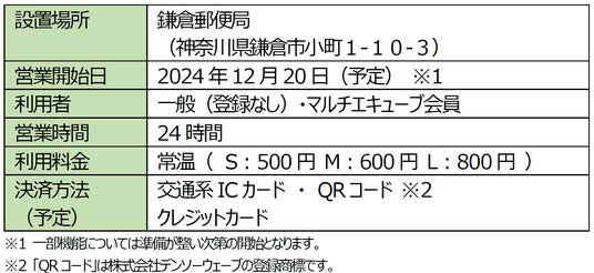 マルチエキューブはJR東日本をはじめとした首都圏の主要駅に設置されておりますが、郵便局での展開は鎌倉郵便局が初導入となります。また今回は館外の設置となり、防滴仕様のロッカーとなっております。