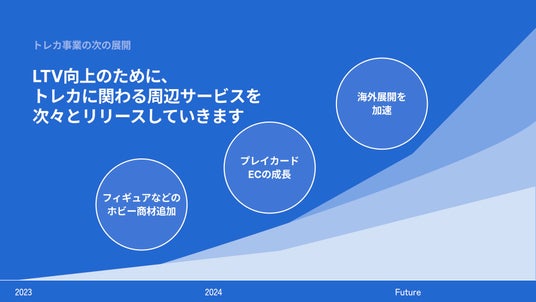 トレーディングカード事業の次の展開として、「ホビー商材など取扱品の拡充」「プレイカードECの成長」「海外展開の加速」を掲げています。特に、海外からのニーズは高く、海外からの売上が当社の売上の30%を占めています。調達した資金を活用し、これらの展開を加速していきます。