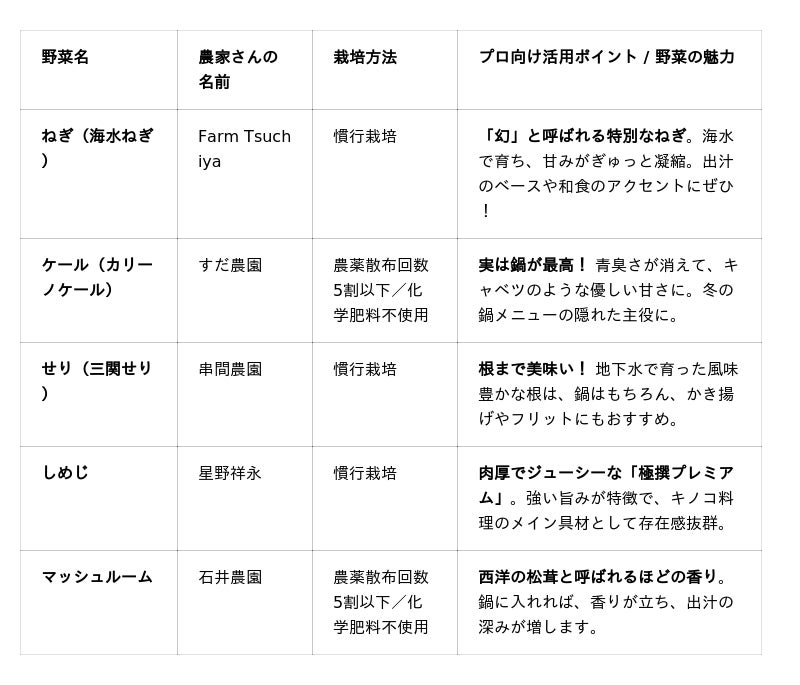 お客様に語れるストーリー: 「海水で育てた幻のねぎ」「300年続く農家のルッコラ」など、