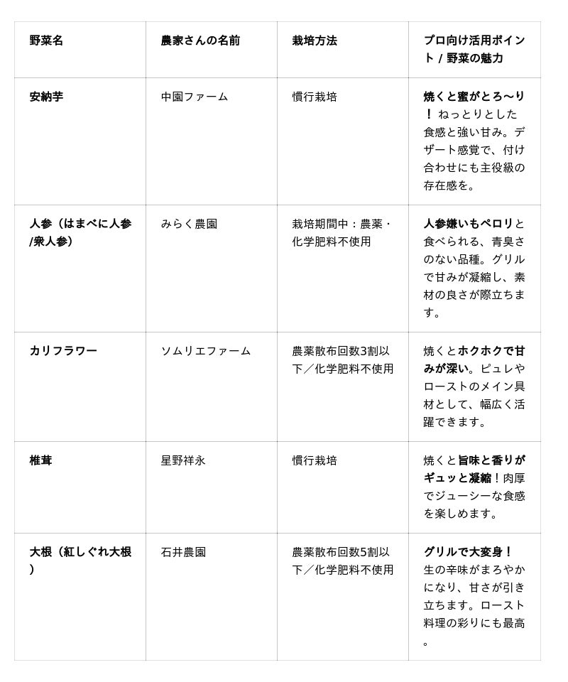 シンプルな加熱こそが最高の調理法! 焼くだけで甘さが爆発し、香ばしさが食欲を刺激する品種たち。焼き野菜、ロースト、BBQメニューの格が上がります。