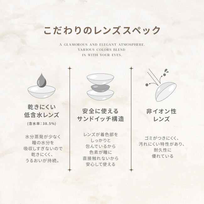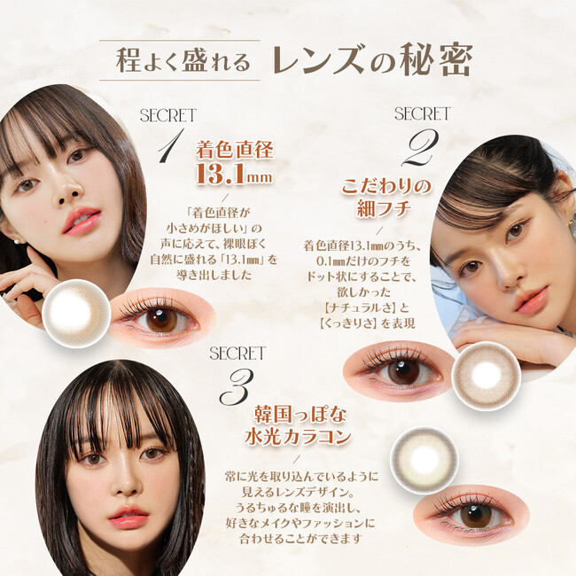 ◎ポイント・好きなメイクやファッションに合わせて楽しむことができる自然な印象の水光カラコンを採用。常に光を取り込んでいるように見えるのに裸眼のように使用できます