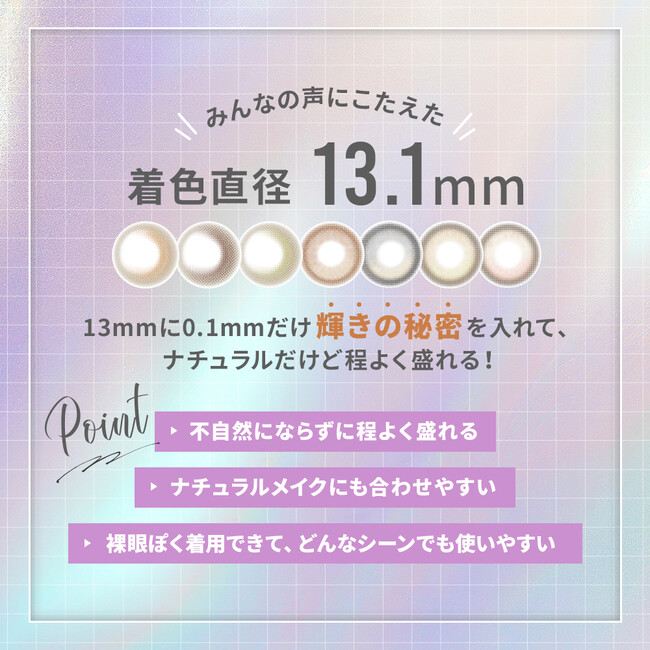 今までのカラコンにあった“盛りすぎ”てしまうことを恐れずに使用できることが最大のポイント。好きなメイクやファッションに合わせて楽しむことができる自然な印象の水光カラコンで、常に光を取り込んでいるように見えるのに裸眼っぽく使用できるので「いかにもカラコン付けて盛ってます!」という状態がなくなります。13mmに0.1mmだけ輝きの秘密を入れ、さらにフチをドット状の細めにすることで欲しかったナチュラルさとくっきりさを表現。低含水レンズが涙を吸収しすぎず目が乾きやすい人や長時間着用したい人にオススメです。いつもの印象を自然なふうに変えたいという大人女子必見のカラーは全7色の展開です。