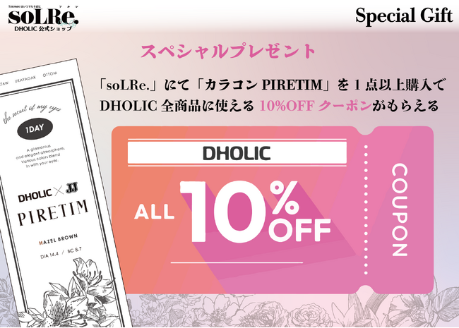 https://solre.style/shop/piretim●TOPIC2. DHOLIC公式ショップ『soLRe.』で購入すると『DHOLIC』全商品に使える10%OFFクーポンがもらえる