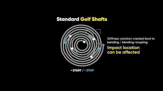 2つ目はシャフトのしなりが使えるため、飛距離がさらに伸びます。既存のシャフトを選ぶ際、ヘッドスピードが速いゴルファーは硬いシャフトを好んでいました。その理由は軟らかいシャフトだとヘッドが正しい位置に戻ってこないので、打点が安定しないからです。なぜヘッドが正しい位置に戻ってこないかというと、意図しない挙動のためです。しかしTPTシャフトにはそれがありません。ヘッドスピードが速いゴルファーが軟らかいシャフトを使っても、ヘッドが正しい位置に戻ってきます。実際、2022年の世界ドラコン大会マスターズ部門で優勝したエディ・フェルナンデス選手はTPTシャフトのラインナップで最も軟らかいレディース用シャフトを使って411ヤード飛ばしました。