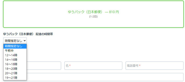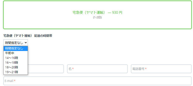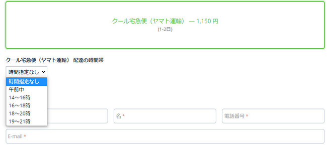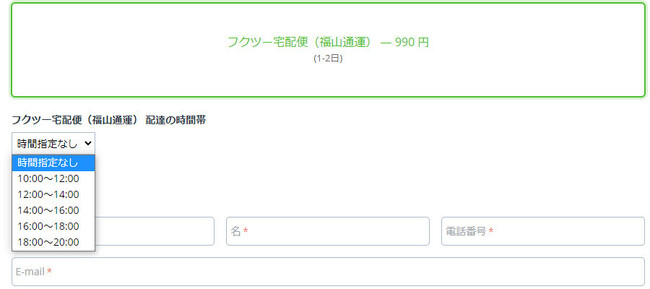 ■日本郵便、ヤマト運輸、佐川急便、福山通運の各配送時間帯の設定が可能に「日本国内向け配送料金自動算出」アドオンのアップデートにより、ユーザーが配送方法を選択すると、注文画面において、配送時に配達時間帯の指定ができるようになりました。
