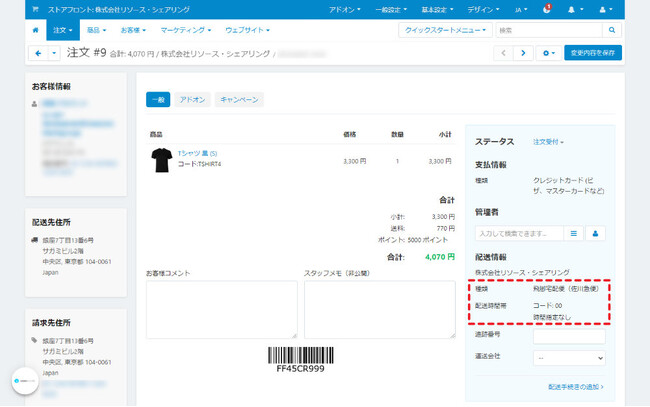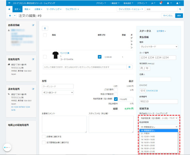 ■管理画面の注文詳細からは配送方法と配送時間帯の変更が可能注文手続きで設定された配送時間帯は、管理画面の注文情報に表示が行われます。