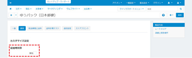 ■管理画面の配送方法から配送時間帯の変更が可能管理画面の「配送方法/税金 > 配送方法」から選択した配送方法にある「設定」の「カスタマイズ設定」で、「配送時間帯」を無効にすると配送時間帯を非表示にできます。