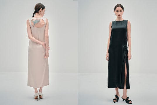 バックデザインブラが美しくに見えるデザイン。シワになりにくく、ボディラインを拾いすぎないスリット入りのサテンドレス。