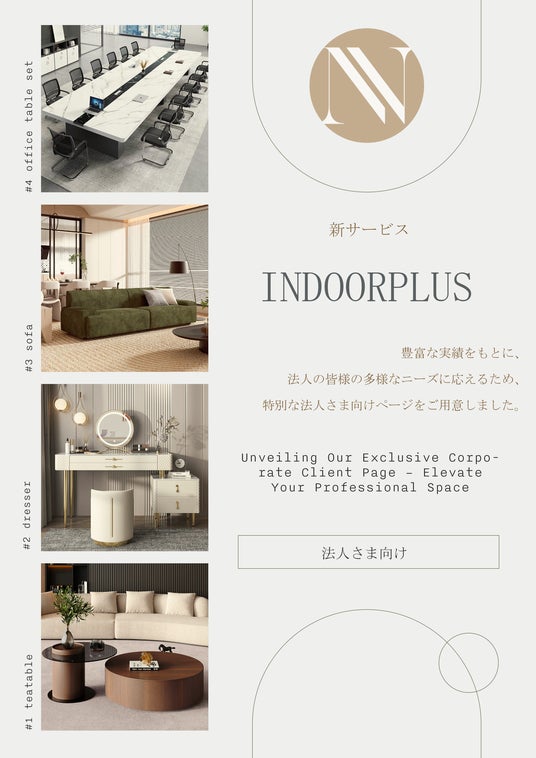 INDOORPLUSは、豊富な実績をもとに、法人の皆様の多様なニーズに応えるため、特別な法人さま向けページをご用意しました。会議用テーブルから受付カウンターまで、業界特化の家具コレクションを通じて、お客様の理想の空間構築をお手伝いいたします。