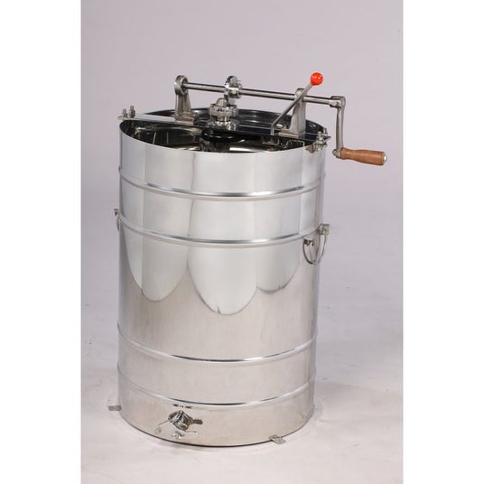 東亜園は、養蜂業者向けに大型の分離機から巣礎、蜜刀まで幅広い養蜂器具を提供し、アマチュア養蜂家のニーズにも対応できるラインナップを揃えています。写真は、採蜜時に使用する手動式分離機です。