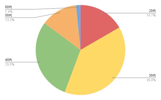 株式会社ノーガード男女比約6:4と副業に取り組む女性も目立つ結果に。30代が39%、40代が29.5%と30~40代が多い結果に